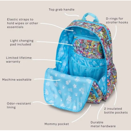 - Pockets – 4 mesh pocket and 1 slip pocket in main compartment; 2 insulated bottle pockets; Cell phone pocket; Mommy pocket